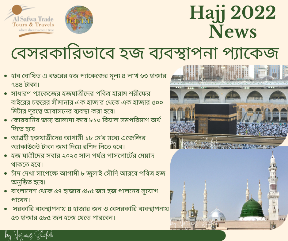Located in Motijheel, Dhaka, Al-Safwa Trade Tours & Travels is a government-approved travel and hajj agent. You should choose their agency because it is the top travel agency in the Motijheel area. They also consistently prioritize client happiness. Health and satisfaction of the hajji's are always important to them. Contact Al-Safwa Trade Tours & Travels so if you wish to perform the hajj and umrah at a reasonable price. In addition to doing the hajj and umrah, you can go to your chosen country.